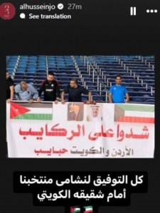 الراي نيوز -  نشر سمو الأمير الحسين بن عبد الله الثاني، ولي العهد، الثلاثاء، صورة عبر خاصية "ستوري" عبر حسابه الشخصي على موقع التواصل الاجتماعي "إنستغرام" حملت شعار "شدوا على الركايب الأردن والكويت حبايب".