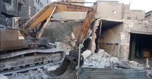 وتعمل الاليات على هدم المبنى وازالة الانقاض كونه اصبح ايلا للسقوط وحفاظا على السلامة العامة.