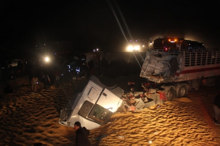 صرحت إدارة الإعلام في المديرية العامة للدفاع المدني بان كوادر الإنقاذ والإسعاف في مديرية دفاع مدني إنقاذ وإسناد الجنوب تعاملت مساء اليوم مع حادث تصادم وقع بين شاحنتين إحداهما محملة بمادة (الذرة) على الطريق الصحراوي / منطقة الحسا, نتج عنه إصابة خمسة أشخاص برضوض وجروح وكسور في مختلف أنحاء الجسم إحداهما كانت محاصرة حيث تم تحرير الإصابة بواسطة المعدات المتخصصة لمثل هذه الحوادث.