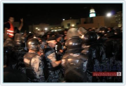 واطلقت قوات الدرك قنابل للمسيلة للدموع على المتظاهرين في ضاحية الرابية، مساء اليوم، لمنعهم من الوصول الى السفارة الصهيونية.