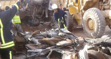 واضطرت كوادر الدفاع المدني للاستعانة بجرافات لرفع القلاب من على المركبة وانتشال الجثتين.
