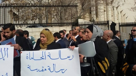 نفذ مجموعة من المحامين اعتصاما اليوم امام مبنى قصر العدل رفضا للاعتداء على المحامين حيث رفع المعتصمون شعارات تطالب بتطبيق نصوص القانون وتؤكد تساوي رسالة الامن العام والمحامين اضافة لعدم وجود خصومه بين حملة رسالة المحاماه ورجال الامن العام .