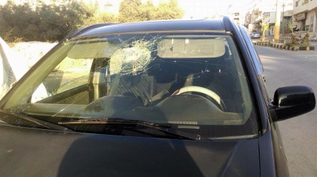 باستخدامه حجرا ومتسبباً بكسر زجاج السيارة الامامي الامر الذ اثار هلعاً بين المارة