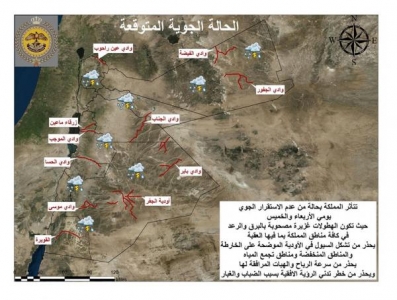 وقالت إدارة الازمات إن هطولات غزيرة للامطار مصحوبة بالبرق والرعد في كافة مناطق المملكة بما فيها العقبة.