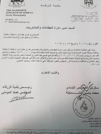 وافق مجلس بلدية الزرقاء على طرح عطاء خلطة اسفلتية لتعبيد شوارع مدينة الزرقاء بكمية مليون و 200 الف متر مربع ، بقيمة 6 مليون دينار.