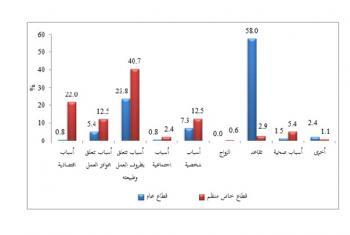 واشارت الدراسة الى انه عند توزيع أسباب ترك العمل حسب قطاع العمل، فقد أظهرت النتائج بان التقاعد كان السبب الرئيس لترك العمل في القطاع العام، حيث بلغت النسبة 58 بالمئة، وقد جاءت الاسباب المتعلقة بطبيعة العمل وظروفه بالمرتبة الثانية بنسبة بلغت 23.8 بالمئة، اما بالنسبة للقطاع الخاص فقد جاءت أسباب ظروف العمل وطبيعته وكذلك الاسباب الاقتصادية في مقدمة اسباب ترك العمل في هذا القطاع بنسب بلغت 40.7 بالمئة، و22 بالمئة على التوالي.