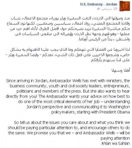 الراي نيوز . نشرت السفارة الأمريكية خبراً يفيد بأن السفيرة الأمريكية في الأردن اليس ويلز تطلب من الاردنيين ارسال مشكلاتهم عبر صفحة السفارة على موقع التواصل الاجتماعي "فيس بوك" للمساعدة في حلها.