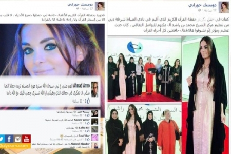 نشرت المغنية اللبنانية دومينيك حوراني على صفحتها الشخصية على موقع التواصل الاجتماعي فيس بوك صورة توضح مشاركتها في حفل تكريم حفظة القرآن الكريم الذي أقيم في نادي ضباط الشرطة بدبي وعلقت دومينيك قائلة " فخورة بحفظة القرآن الكريم الأطفال خاصة الذين حفظوا جميع الأجزاء، لا قلب يستريح إلا بين أسطر القرآن ولا راحة داخلية إلا بالقراءة، مما أثار استياء المتابعين ووصفوها بالمهزلة فالأطفال يحتاجون إلى قدوة حسنة على حد قولهم، بينما دعا لها آخرون بالهداية ".