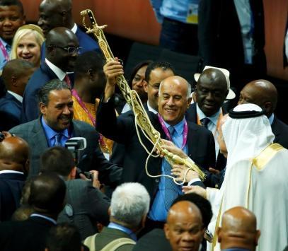 السيف قدمه باليد رئيس الاتحاد الفلسطيني جبريل الرجوب والفرحة تغمره بعد فوز بلاتر.