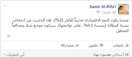 علق رئيس الوزراء الاسبق دولة سمير الرفاعي على حسابه الخاص على موقع التواصل الاجتماعي فيس بوك ان النمو الاقتصادي مخيبا للامال وقال :