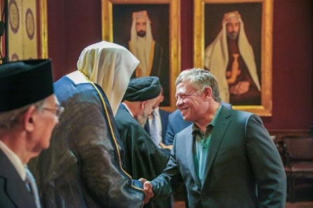 الملك يلتقي وفد مجلس حكماء المسلمين في قصر بسمان