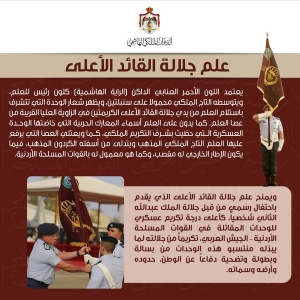 ويعكس تسلّم التشكيلين العسكريين لعلم جلالة القائد الأعلى، والذي جرى في مراسم عسكرية مهيبة وبحضور عدد من أصحاب السمو الأمراء وكبار رجال الدولة من مدنيين وعسكريين، رسالة تقدير ملكية للوحدات العسكرية في القوات المسلحة الأردنية – الجيش العربي.