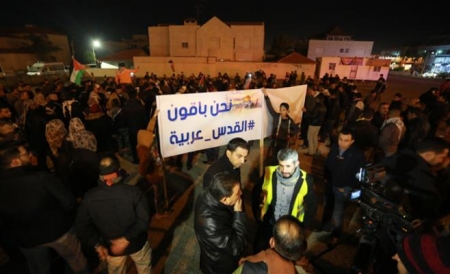 لليوم الخامس على التوالي، يستمر مواطنون ونشطاء سياسيون وحزبيون بالاعتصام في محيط السفارة الأميركية بعمان، رفضا لقرار الرئيس الأميركي دونالد ترامب، الذي أعلن القدس عاصمة لإسرائيل إلى جانب نقل السفارة الأميركية إليها.