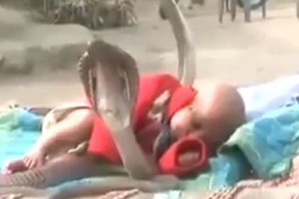 فيديو... 4 أفاعي كوبرا تلاعب رضيعا