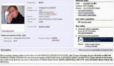 واضافت أن أوزبورن كتب في إعلان على المزاد الإلكتروني "خذوا زوجتي الكاذبة والمخادعة والعاهرة بالسعر المناسب”، مشيرة إلى أن شارون (43 عاماً) انكرت أن تكون خانت زوجها واقامت علاقة مع رجل آخر. واعلنت الشرطة البريطانية أنها فتحت تحقيقاً مع الزوج بتهمة المضايقة.