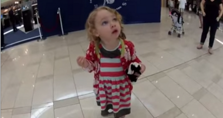ويظهر الفيديو طفلة صغيرة شقراء تسير مع والدها ووالدتها في أحد الأسواق عندما رفع الآذان، لتبدأ بالالتفات يمنة ويسرة وتبدو على وجهها علامات الدهشة والاستغراب.