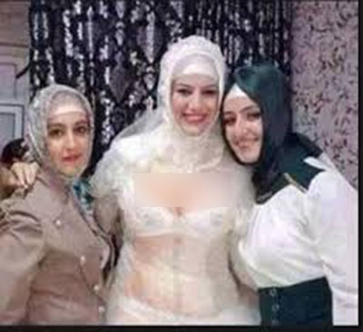 وأظهرت الصورة الفتاة ترتدي حجاب أبيض وفستان زفاف مكشوف وبجوارها صديقاتها المحجبات، ما أثار موجة تعليقات غاضبة، من التناقض الغريب في ارتدائها لفستان مكشوف وحجاب.