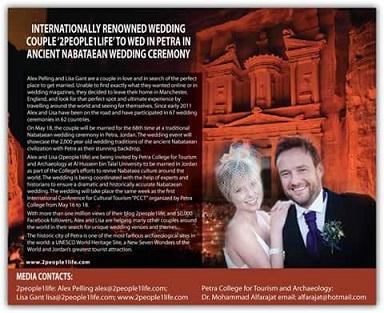 أليكس بيلنج وليسا غرانت، زوجان إنجليزيان من مدينة مانتشستر، قررا السفر حول العالم بحثاً عن المكان الأمثل للاحتفال بزفافهما. فبعد بحث مستفيض عبر الإنترنت والمجلات والمنشورات المتخصصة بالأعراس، بدأ الزوجان رحلتهما حول العالم. فمنذ العام 2011 لايزال الزوجان يحتفلان بزفافهما؛ إذ بلغ عدد الحفلات لغاية الآن 67 حفلة زفاف مميزة أقيمت في 62 دولة. أما الآن فتستعد مدينة البترا الأثرية في المملكة الأردنية الهاشمية لإقامة حفل زفاف أليكس وليسا الثامن والستين، المقرر في 18 أيار من العام الحالي، ليعيد إحياء العادات والتقاليد النبطية التي تعود لألفي عام مضت. أليكس وليسا تلقيا دعوة من كلية البترا للسياحة والآثار في جامعة الحسين بن طلال ليقيما حفل زفافهما في الأردن، ضمن مبادرة الجامعة لإحياء التراث النبطي والترويج له حول العالم. يجري حالياً العمل على تنظيم الزفاف بمساعدة خبراء أثريين ومؤرخين للتأكد من أن الزفاف يتم وفقاً للطريقة النبطية القديمة تماماً. وسيتزامن حفل الزفاف مع أسبوع المؤتمر الدولي الأول للسياحة الثقافية التي تنظمه كلية البترا للسياحة والآثار والذي سيستمر من 16 وحتى 18 أيار 2015 حسبما صرح عميد الكلية ورئيس اللجنة العليا للمؤتمر الدكتور محمد الفرجات. للعروسان مدونة باللغة الإنجليزية "2people1life" ، (أي اثنان وحياة واحدة)، يتابعها أكثر من مليون مشاهد ، إضافة إلى صفحة على الفيسبوك حصدت 50 ألف معجب. يقوم العروسان كذلك بمساعدة الراغبين بالزواج من جميع أنحاء العالم على إيجاد واختيار أماكن وأنماط فريدة ومميزة للاحتفال بزفافهم. تعد مدينة البترا الأثرية واحدة من أكثر المواقع الأثرية شهرة حول العالم، فهي مدرجة على لائحة اليونسكو لمواقع التراث العالمي وواحدة من عجائب الدنيا السبع الجديدة وأكبر موقع جذب سياحي في الأردن.