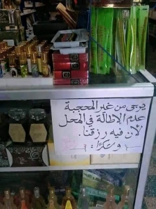 عمان 'لافتة' مكتوب عليها 'يرجى من غير المحجبة عدم الإطالة في المحل لأن فيه زرقنا٬ وشكرا'.