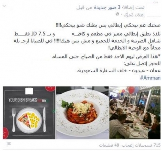 نشر مطعم، ومقهى شهير في العاصمة عمّان عرضا بتقديم "الأرجيلة" بالمجان لـ"الصبايا" فقط. ونشر الحساب الرسمي للمطعم الشهير على موقع التواصل الاجتماعي "فيس بوك"، إعلاناً جاء فيه: (صحنك عم بيحكي إيطالي بس بطنك شو بيحكي!!!!، تلذذ بطبق إيطالي مميز في مطعم و كافيــه ****** و بــ 7.5 JD فقـــــط شامل الضريبة و الخدمة للجميع و مش بس هيك!!!!! في للصبايا ارجـ يلة مجاناً مع الوجبة الايطالي!) وأشار الإعلان إلى أنه يسري في يوم الأحد فقط من الصباح حتى المساء. وقال ناشطون إنه وبالإضافة إلى "استفزازية" الإعلان بتخصيص الفتيات دون الذكور بتدخين "الأرجيلة" بالمجان، فإنه أيضاً مخالف لقانون الصحة العامة رقم (46) لعام 2008 والذي نص على منع الإعلان عن منتجات التبغ عبر وسائل الإعلام. وأوضح مدير التوعية والإعلام الصحي في الوزارة الدكتور مالك الحباشنة في وقت سابق أن الترويج لـ"الأرجيلة" ضمن إعلانات مطاعم منشورة في الصحف يعتبر مخالفاً للقانون، ويُعاقب بموجبه صاحب المطعم والصحيفة على حد سواء. وأشار إلى أن عقوبة الترويج لمنتجات التبغ ومنها "الأرجيلة" تصل إلى الحبس لمدة تتراوح من 3 شهور إلى ستة شهور أو بغرامة مالية لا تقل عن خمسمائة دينار ولا تزيد على ألف دينار.