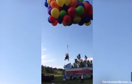 - أظهرت لقطات مصورة مثيرة للدهشة نشرت على موقع يوتيوب الإلكتروني، مغامراً وهو يحلّق في السماء باستخدام عشرات البالونات الملونة.