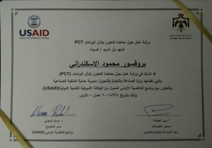 تسلم البروفيسور محمود اسكندراني الاستاذ بجامعة عمان الاهلية شهادة المشاركة في ورشة العمل الخاصة ببراءات الاختراع من وزارة الصناعة والتجارة والتموين بالتعاون مع USAID. وقد ترتب على تلك المشاركة والمباحثات مع الوزارة توقيع اتفاقية ما بين جامعة عمان الأهلية ووزارة الصناعة والتجارة والتموين بحيث أصبحت جامعة عمان الأهلية معرفة على جميع الشبكات المتصلة بالوزارة واستعدت الوزارة لإعطاء دورات تدريبية مجانية لمن تختارهم الجامعة في مجال الملكية الصناعية والعلامات التجارية وتسجيلها وتسجيل براءات الاختراع إضافة إلى العمل لكي تصبح الجامعة مرجعا في مجال الملكية الفكرية.