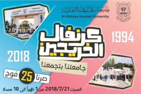 برعاية معالي د. يوسف الشواربة أمين عمان تقيم دائرة العلاقات العامة والدولية في جامعة عمان الأهلية يوم السبت المقبل الموافق 21/7/2018 كرنفالاً احتفاليا لخريجي الجامعة وعائلاتهم يتضمن العديد من الفقرات المتنوعة والمسابقات ومنطقة خاصة بالأطفال وبازاراً والعديد من الفعاليات التي تجمع الخريجيين من 25 فوجا خرجتهم الجامعة (1994- 2018) ، حيث ستبدأ الفعاليات  على تمام الساعة 1:00 ظهراً وتستمرلغاية الساعة 10:00 مساءً.