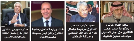 اوضح نقيب المهندسين عبد الهادي الفلاحات ان اي خطوة تتخذها الحكومة المعنية المتمثله بالسلطة التنفيذية او التشريعية للوقوف والإستجابة لمطالب الناس هي خطوة إيجابية نقدرها ، وطالب بان يكون النقاش حول هذا القانون في حال ارادت الحكومة اعادته من جديد فيجب أن يكون النقاش والحوار مع النقابات المهنية وعلى راسها نقابة الصحفيين فهي اكثر المعنيين بهذا القانون ويتم الإتفاق على قانون يضفي الى نتائج مرضيه تشيع اجواء الحرية .