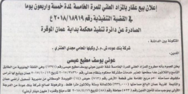 أعلنت دائرة تنفيذ محكمة بداية عمان بيع شقة تعود لرجل الاعمال المتهم بقضية السجائر المقلده عوني مطيع بالمزاد العلني بمبلغ مليون دينار لصالح دين لشركة بنك عودة .