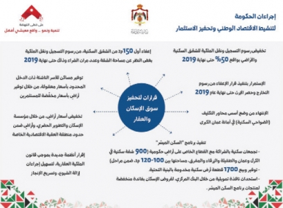 وإعفاء أول 150 مترا مربعا من الشقق السكنية من رسوم التسجيل ونقل الملكية المحدود بأسعار معقولة من خلال توفير أراض بأسعار منخفضة للمستثمرين، بالإضافة إلى تخفيض أسعار أراض من خلال مؤسسة الإسكان والتطوير الحضري وأراض ضمن حدود منطقة العقبة الاقتصادية الخاصة.