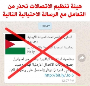 قالت هيئة تنظيم قطاع الاتصالات إنها تابعت عن كثب ما تم الاعلان عنه في بعض وسائل التواصل الاجتماعي عن ورود رسائل نصية قصيرة للمواطنين تفيد بإضافة رصيد مجاني بقيمة خمسة دنانير بمناسبة استعادة منطقة الباقورة، حيث قامت الهيئة على الفور بالتحقق منها عن طريق التواصل مع الشركات ذات العلاقة التي نفت إصدار مثل هذه الرسائل وهي عارية عن الصحة.