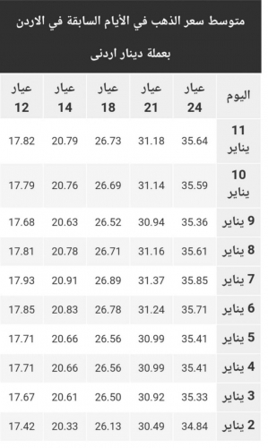 ويشمل التقرير أسعار المعدن بجميع عياراته (عيار 24, 22, 18, 14, 12) في الاردن.