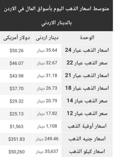 وتحتوي أيضا علي مخطط بمعدل الارتفاع والانخفاض في اسعار الذهب اليوم في الاردن في الأيام السابقة في السوق الأردني.