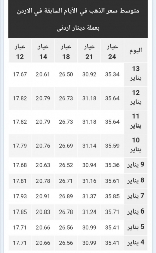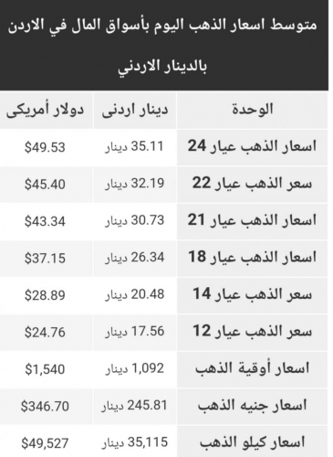 وقال أمين سر نقابة أصحاب محلات تجارة وصياغة الحلي والمجوهرات، ربحي علان إن سعر بيع الغرام من المعدن الاصفر عياري 24 و18 لغايات الشراء بلغ 40ر36 و10ر28 دينار على التوالي.