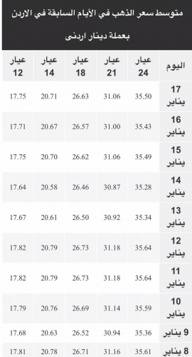 ويشمل التقرير أسعار المعدن بجميع عياراته (عيار 24, 22, 18, 14, 12) في الاردن.
