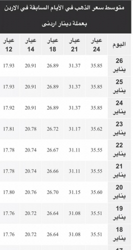 ويشمل التقرير أسعار المعدن بجميع عياراته (عيار 24, 22, 18, 14, 12) في الاردن.