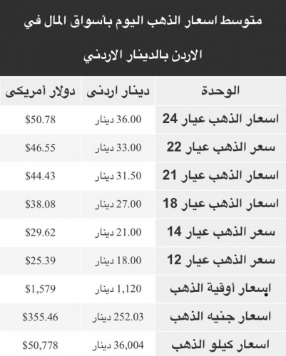 التقرير الدوري والمتجدد لأسعار معدن الذهب اليوم في الأردن بالدينار وأيضا بالدولار الأمريكي.
