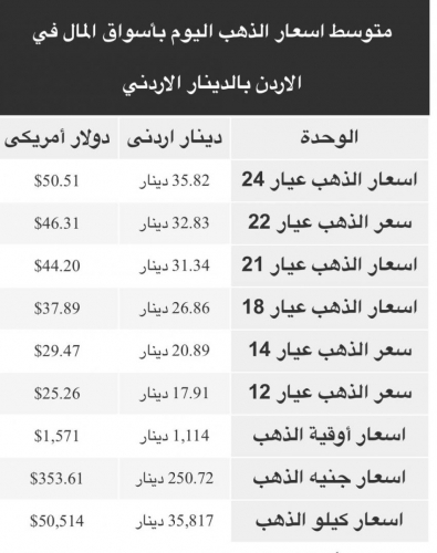 التقرير الدوري والمتجدد بأسعار معدن الذهب اليوم في الأردن بالدينار وأيضا بالدولار الأمريكي.