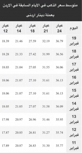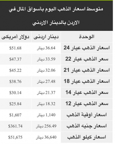 وبلغ سعر بيع الغرام من الذهب عياري 24 و18 لغايات الشراء من محلات الصاغة 36.64 دينار و 27.48 دينارا على التوالي.