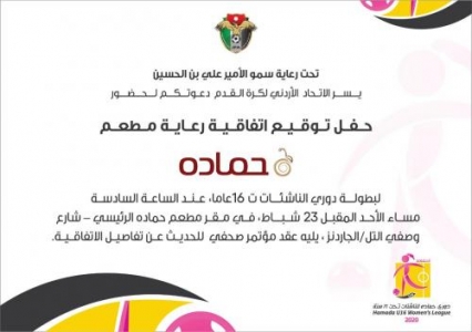 يرعى سمو الامير علي بن الحسين رئيس الهيئة التنفيذية لاتحاد الكرة، مراسم توقيع اتفاقية الرعاية بين اتحاد الكرة، و"مطعم حماده"، عند السادسة مساء الاحد المقبل 23 شباط، في مقر نادي حمادة بـ الجاردنز.