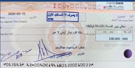 المدير التنفيذي لشركة عبدون مول (مكة مول) السيد عبيدة الكردي يتبرع بقيمة راتبه بالكامل لمدة سنة والبالغ قيمته 100 ألف دينار أردني لوزارة الصحة لدعم جهودهم لمواجهة انتشار فايروس كورونا.