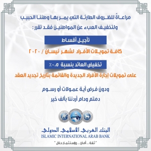 استجابة للظروف الاستثنائية التي تمر على الوطن بسبب أزمة الكورونا وانسجاما مع قرارات البنك المركزي فقد قرر البنك العربي الإسلامي الدولي تأجيل كافة أقساط تمويلات الأفراد عن شهر نيسان/2020 بالإضافة إلى تخفيض عائد الإجارة المنتهية بالتمليك بنسبة 0.5% سواء للتمويلات القائمة والجديدة.