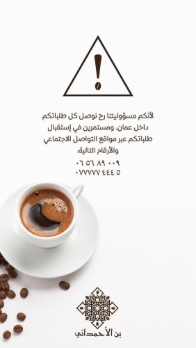 اعلن 'بن الاحمداني' عن توصيل جميع الطلبات داخل العاصمة عمان وذلك من باب المسؤولية التي تعهد بها لحماية الزبائن والحفاظ على سلامتهم .