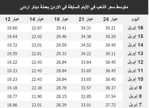 بالاضافة الى اسعار المعدن الاصفر خلال الايام السابقة، ومخطط بمعدل الارتفاع والانخفاض في الاسعار.