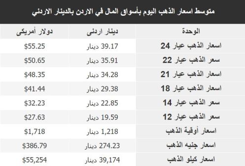 اظهر التقرير الدوري والمتجدد الخاص بأسعار الذهب في الأردن، الجمعة، ارتفاعاً بأسعاره، حيث بلغ سعر المعدن من عيار 24 مبلغ 39.17 دينار.