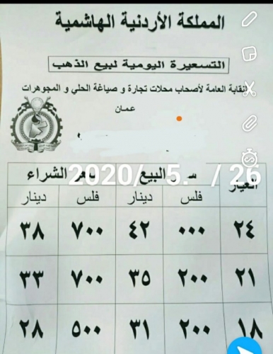 وبحسب التسعيرة اليومية التي تصدرها النقابة العامة لأصحاب محلات تجارة وصياغة الحلي والمجوهرات، فقد بلغ سعر بيع الغرام من الذهب عياري 24 و18 لغايات الشراء من محلات الصاغة عند 42 دينارا و31.200 دينارا.