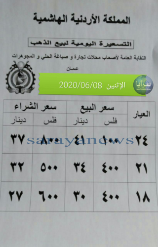 وبحسب التسعيرة اليومية التي تصدرها النقابة العامة لأصحاب محلات تجارة و صياغة الحلي والمجوهرات، فقد بلغ سعر بيع الغرام من الذهب عياري 24 و18 لغايات الشراء من محلات الصاغة عند 41.100 دينارا و 30.400 دينارا.