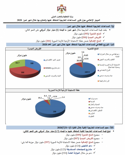 بلغت قيمة المساعدات الخارجية المتعاقد عليها والملتزم بها خلال شهر تموز الماضي، مليار دولار أميركي، بحسب الموجز الإعلامي حول تقرير المساعدات الخارجية للأردن الصادر عن وزارة التخطيط والتعاون الدولي.