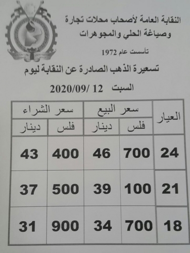 ووفق النقابة العامة لأصحاب محلات تجارة وصياغة الحلي والمجوهرات، فقد بلغ سعر بيع الغرام من الذهب عياري 24 و18 لغايات الشراء من محلات الصاغة عند 46.70 و 34.70 دينار على التوالي.