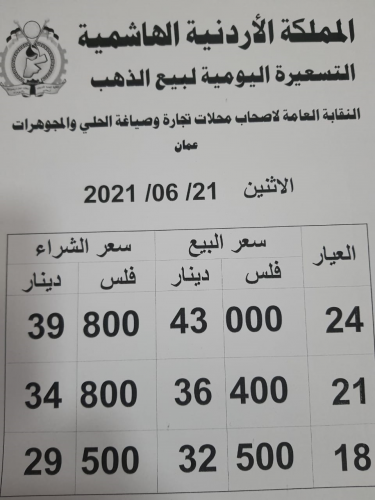 أسعار الذهــــب اليوم الاثنين 21/6/2021 بالعملة الوطنية الدينار الأردني ، وفق النقابة العامة لأصحاب محلات تجارة وصياغة الحلي والمجوهرات.